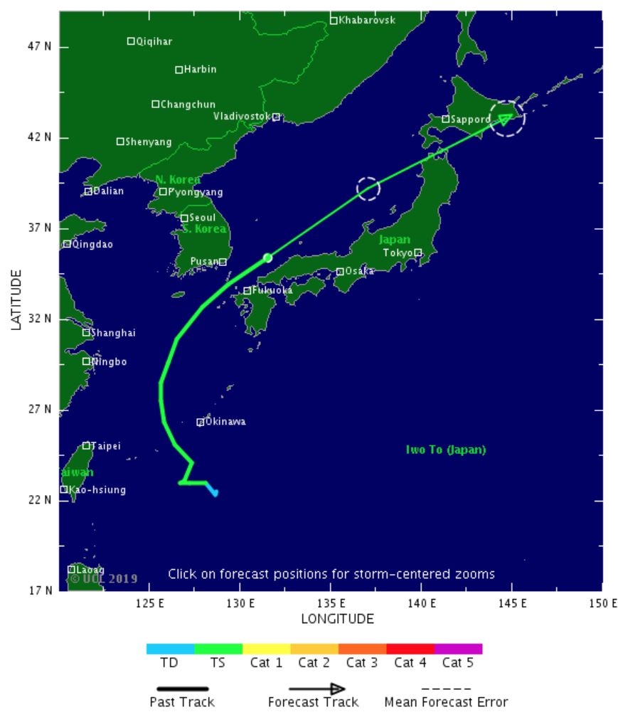 Les dernières prévisions indiquent, avec une marge d'erreur encore notable, que le système devrait rester en mer du Japon avant de terminer sa course le 23 septembre sur l'île septentrionale Hokkaido. Durant tout son périple il n'est à l'heure actuelle pas prévu que la tempête s'intensifie jusqu'au stage de typhon.