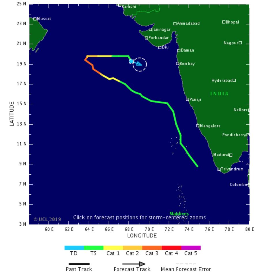 Les prévisions de trajectoire sont donc plutôt défavorables pour le Nord-Ouest de l'Inde. Toutefois, Maha est prévu s'affaiblir avant de toucher terre. Les agences humaines (CMRS de New Delhi et JTWC) s'accordent sur ce scénario. Le système ne serait plus qu'une tempête tropicale largement affaibli au moment de l'atterrissage. Le renforcement du cisaillement d'altitude néfaste aux systèmes dépressionnaires tropicaux, explique cet affaiblissement significatif attendu ces prochaines 72h.