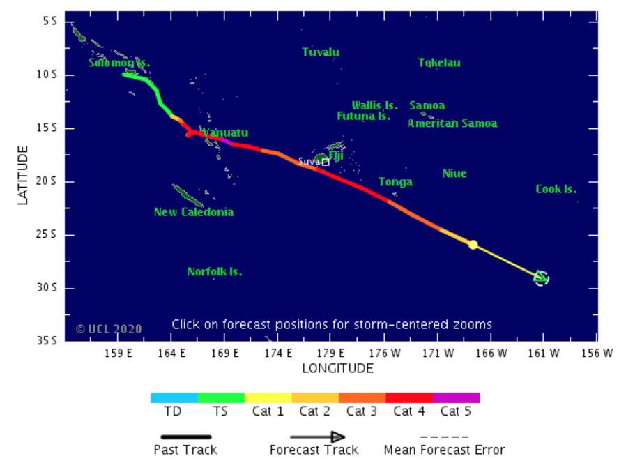 Après avoir saccagé le Vanuatu, Harold va suivre une trajectoire orientée vers le Sud-Est, toujours pilotée par la dorsale équatoriale située au Nord-Est du système. Sur ce cap, le cyclone s'approche des Fidji et un transit à proximité Sud-Ouest de l'île principale de Viti Levu, devrait se faire dans les prochaines 24h. Le degré d'impact pour l'île dépendra de la distance du passage au plus près. Étant donné la structure concentrée du phénomène, il faudrait un passage à moins de 50 km des côtes pour des conditions cycloniques.