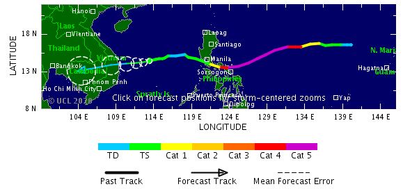 Il est prévu d'atteindre la catégorie des typhons dans les 24 heures et continuera de s'intensifier tout en se déplaçant au-dessus de la mer des Philippines. Il devrait toucher terre le 01 novembre sur le Nord de l'archipel sous la forme d'un typhon équivalent à la catégorie 4 sur l'échelle de Saffir-Simpson (vents à 225 km/h). Les dernières prévisions indiquent que la région de Manille ne devrait pas être directement touchée (le centre du système passera plus au Nord) mais sera vraisemblablement très affectée.