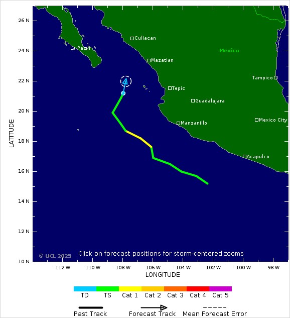 Même si le système reste en mer, des pluies intenses sont attendues dans les États mexicains de Guerrero, Michoacán, Colima et Jalisco. Les cumuls pourraient atteindre 2 à 4 pouces (50 à 100 mm), avec des pointes locales à 150 mm, pouvant entraîner des crues soudaines et des glissements de terrain, notamment dans les zones montagneuses.