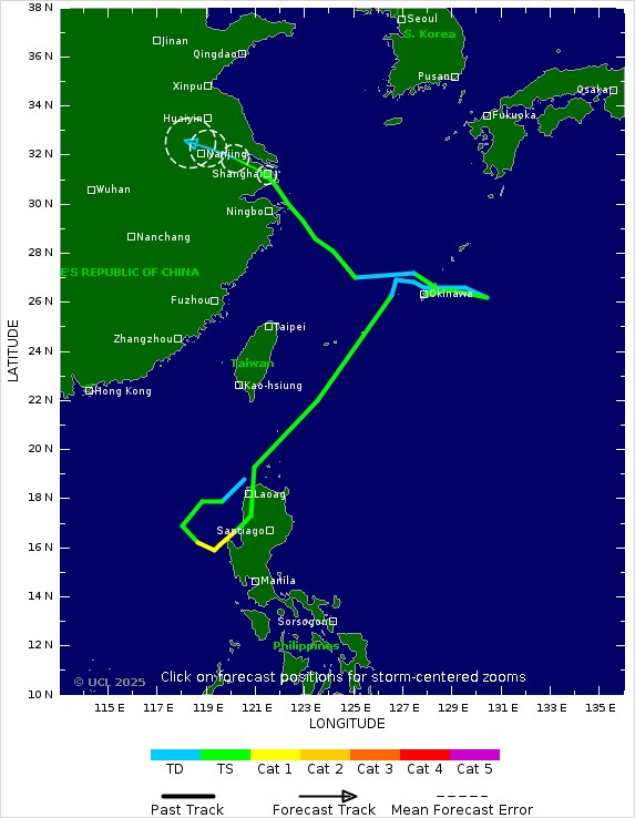 25/07 : Co-May a retrouvé la mer après avoir touché le Nord des Philippines et se dirige vers le Nord-Ouest. Il devrait tangenter les côtes Est de Taïwan dans les prochaines 24 h et y provoquer de fortes pluies.