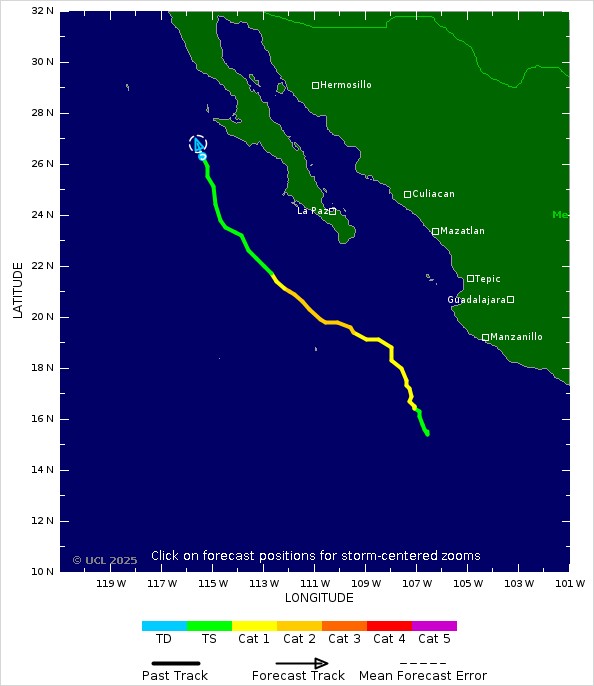Le système devrait continuer sa remonter en latitude en perdant de la vigueur. Il devrait toucher terre sous la forme d'une tempête tropicale à l'Ouest de la péninsule de Baja.