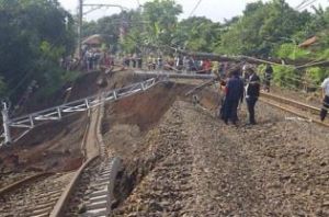 Un glissement de terrain consécutif à de fortes pluie s'est produit le long de la voie ferrée reliant Bojong Gede à Clibebut dans le district indonésien de Bogor.