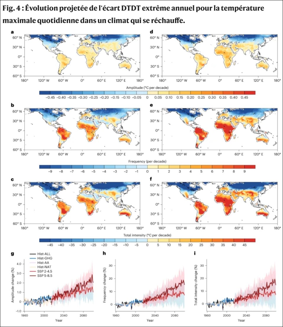 Les projections des modèles climatiques indiquent que cette tendance se poursuivra. Dans un contexte de scénario à fortes émissions, la fréquence et l’intensité totale de ces événements de températures extrêmes pourraient augmenter d’environ 17 % et 20 % respectivement d’ici 2100, affectant des régions où vivent plus de 80 % de la population mondiale.