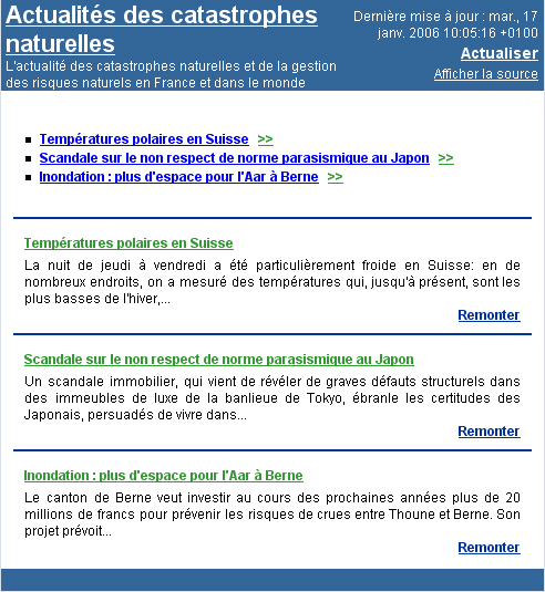 - Les dernières actualités parues sur notre site. Ce flux RSS reprend l'ensemble des articles figurant sur notre page d'accueil (veilles des catastrophes, veille de la gestion des risques, veille changements climatique, veille données et statistiques et veille réglementaire).