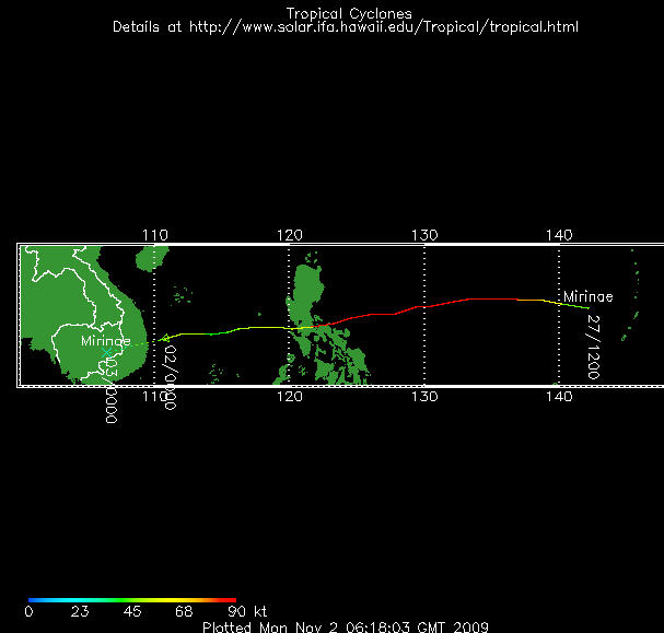 A l'heure actuelle Mirinae est situé à 1700 km à l'Est de Manille et génère des vents soufflant à 170 km /h en rafale. D'après les services météorologiques, Mirinae devrait poursuivre sa route plein Ouest en se renforçant considérablement pour atteindre la catégorie 3/5 sur l'échelle de Saffir Simpson à proximité des côtes Philippines qu'il devrait atteindre samedi. Manille ne devrait pas être directement touchée mais risque d'être très affectée par les pluies diluviennes qui accompagne le typhon.