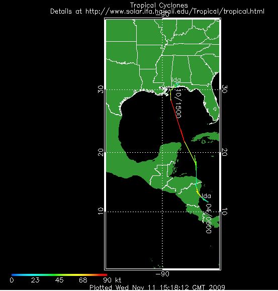 Actuellement le système génère des vents moyens de l'ordre 65 km/h et de très fortes pluies. Ida continue sa trajectoire vers le nord nord-ouest à la vitesse moyenne de 7 km/h. Il devrait reprendre de la vigueur lorsqu'il atteindra de nouveau les eaux chuades de la Mer des Caraïbes d'ici 24 h.