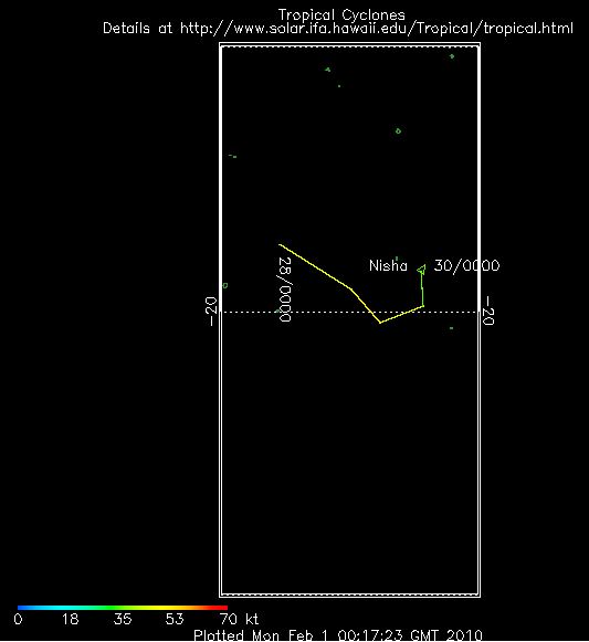 Nisha touche actuellement la République des Kiribati (ensemble de petites îles), dans les prochains jours ce système qui devrait rester au stade de tempête tropicale pourrait traverser la Polynésie française, même si les prévisions de trajectoire font passer la tempête au sud de l'archipel.