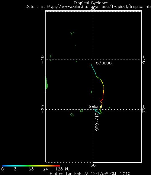 18/02 : Gélane a perdu sa configuration en oeil associée au stade de cyclone tropical. Forte tempête tropicale depuis ce mercredi, Gélane devrait poursuivre sa trajectoire en direction du Sud avant d'effectuer un virage vers le Sud puis le Sud-Ouest d'ici 48 heures, sous l'effet de l'anticylone qui transite actuellement à plusieurs milliers de kilomètres au Sud des Mascareignes.