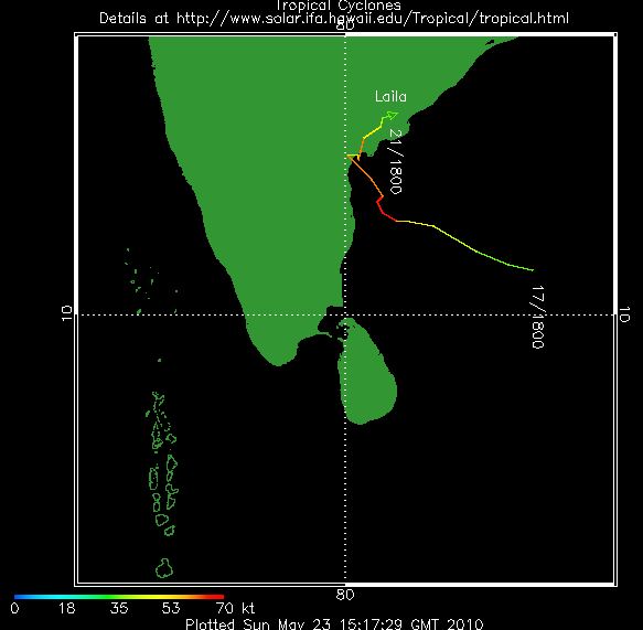 Le système est actuellement situé à 1310 km au Sud-Sud-Ouest de Chittagong (2ème ville du Bangladesh) et génère des vents soufflant à 80 km/h. Laila devrait encore s'intensifier dans les prochaines 24 h pour devenir un cyclone tropical.