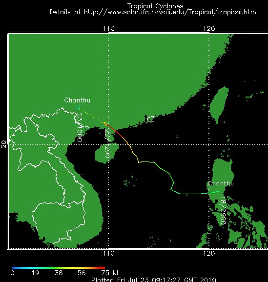 21/07 : La tempête tropicale Chanthu, née en Mer de Chine, se dirige vers Hong Kong, qu'elle devrait atteindre ce soir. Le système qui pourrait se renforcer en typhon de catégorie 1 juste avant de toucher terre, est actuellement situé à environ 380 km au sud de Hong Kong et se déplaçait vers l’ouest nord-ouest à la vitesse moyenne de 13 km/h près de la côte du Guangdong.