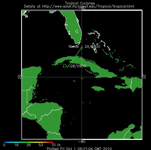 Nicole, se déplace en direction du Nord-Est à la vitesse moyenne de 15 km/h, les vents soufflent à 65 km/h en moyenne près du centre et 80 km/h en rafale. La pression est estimée à 996 hPa.