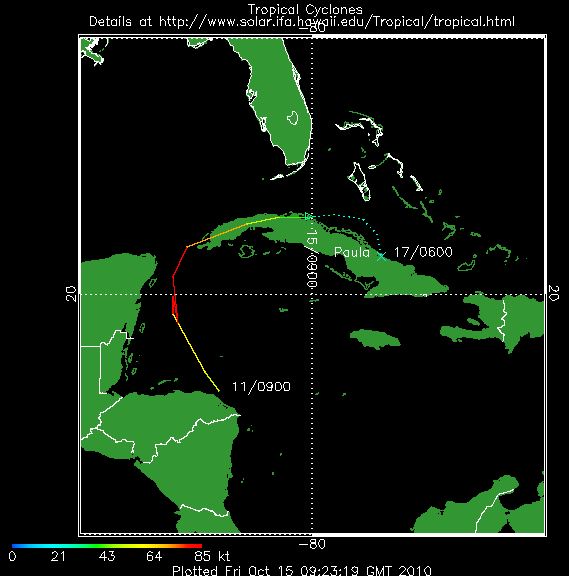 A 21H00 GMT, Paula se trouvait à 210 km à l'est-sud-est de l'île de Guanaja, au Honduras, et progressait à la vitesse de 15 km/h vers le nord-ouest avec des vents soufflant à 95 kmh. La tempête devrait se renforcer et devenir le 9e ouragan de la saison aujourd'hui et pourrait atteindre le stade de cyclone de catégorie 2 à plus longue échénace indique le NHC.