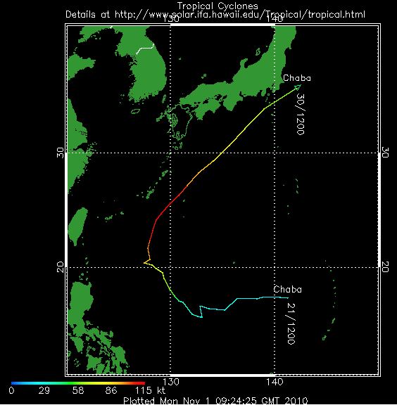 Le typhon Chaba s'est formé il y a 48 h dans le Nord-Ouest du bassin océanique Pacifique Nord. Actuellement classé en cyclone de catégorie 3 sur 5 sur l'échelle de Saffir-Simpson est situé au sud de l'archipel japonais d'Okinawa qu'il devrait atteindre dans les prochaines heures.
