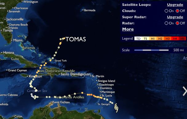 30/10 : Tomas, la 19ème tempête de la saison des ouragans dans l'océan Atlantique, devrait se renforcer et se transformer en ouragan dans les prochaines heures, selon le centre national américain des ouragans. Elle est accompagnée de vents soufflant à 65 km/h et se trouvait, à 21H00 GMT, à 320 km de la Barbade, l'ile située à la frontière de la mer des Caraïbes et de l'océan Atlantique.