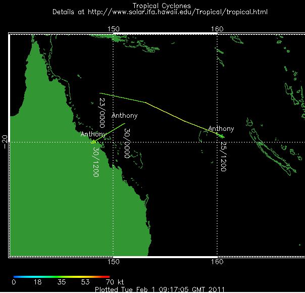 La tempête tropicale Anthony s'apprête a touché les côtes de l'Etat australien du queensland. Au bulletin de 00h UTC (1h heure française), la tempête tropicale Anthony se situait à 18.3° de latitude sud et 151.1° de longitude est, elle se déplaçait vers le sud-ouest à la vitesse de 16 noeuds. Le vent moyen atteignait les 65km/h, les rafales maximales les 85km/h.
