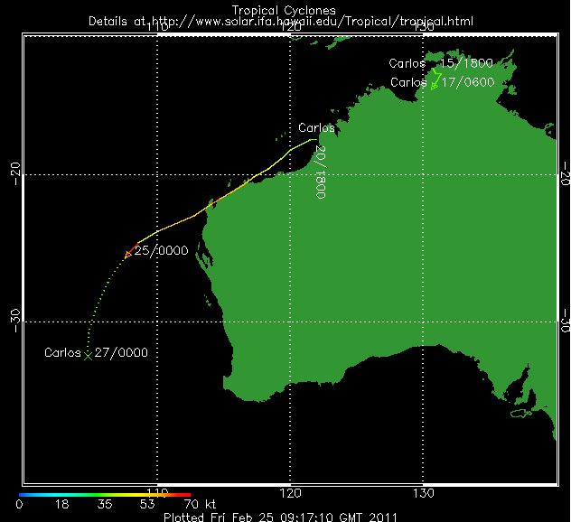 22/02: la tempête tropicale Carlos, qui a apporté la semaine dernière plus de 500 mm de pluie sur Darwin, s'est reformée. Après s'être totalement dissipé dans les terres, le système dépressionnaire se réorganise en retrouvant les eaux chaudes de la mer de Timor. Il a apporté de fortes pluies sur la région de Broome ce week-end, et menace d'ici demain la région d'Onslow.