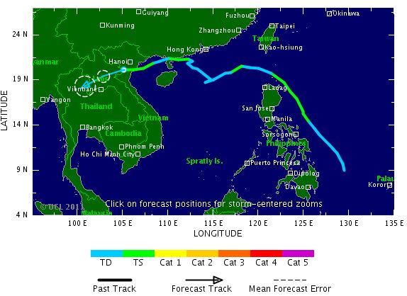 Cette tempête tropicale se déplace vers le nord tout en restant au large des côtes philippines. Même si les vents ne se renforcent pas davantage, une houle importante se développe à proximité de son passage. La situation est plus délicate sur l'île de Luçon qui est touchée ce dimanche par cette tempête. De fortes pluies s'y produisent et peuvent provoquer des glissements de terrain ou des inondations d'autant que les sols sont gorgés d'eau après les passages des typhons Mirinae, Conson et Megi sur l'archipel.