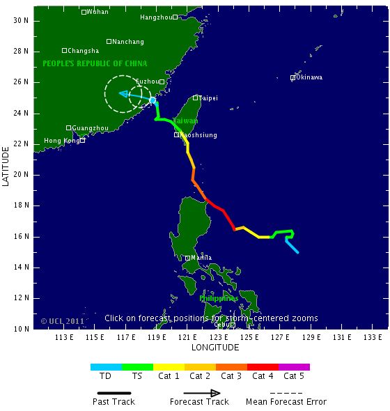 28/08 : Nanmadol, qui est désormais un typhon de catégorie 2, se dirige droit vers l'île de Taïwan qu'il devrait frapper dès demain matin (heure locale). Le typhon devrait ensuite bifurquer vers l'ouest et frapper les provinces chinoises de Fujian et de Guangdong.