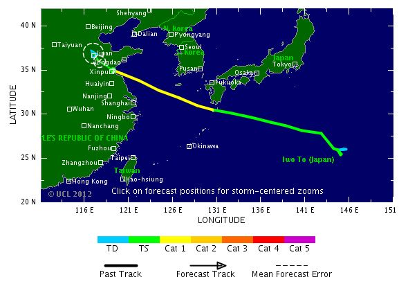 Damrey devrait poursuivre sa route vers l'ouest nord-ouest et passer au large de l'île d'Iwo Jima dans moins de 24h, sa trajectoire pourrait ensuite l'amener à frapper l'extrême sud du Japon avant de finir sa route dans la région de Shanghai, en Chine.
