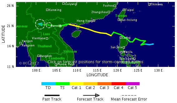 Cette dépression, qui passera au stade de tempête dans les prochaines heures, se dirige vers la côte chinoise, en circulant entre le nord de l'archipel phlippin et le sud de Taïwan où la houle cyclonique se renforcera. De fortes pluies (plus de 150 litres d'eau au m²) sont attendues.