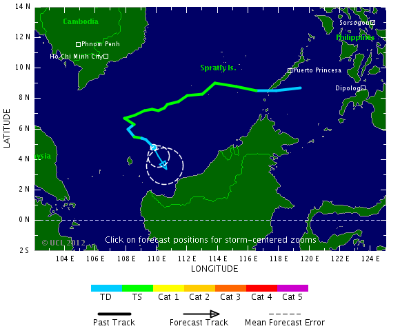 A plus longue échéance, ce phénomène pourrait constituer une menace pour les côtes malaisiennes, au stade de dépression ou tempête tropicale. Plus que les vents, ce sont les très importantes précipitations et la houle cyclonique voisine de 6 m qui sont à redouter sur cette partie de l'Asie.