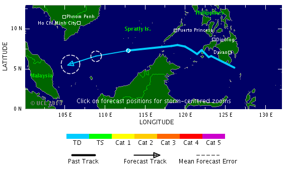 Actuellement le système génère des vents soufflant à 65 km/h et il fait route à l'Est-Nord-Est. Sa trajectoire devrait l'amener à toucher plusieurs archipels et peut-être a affecter le Sud du Vietnam.