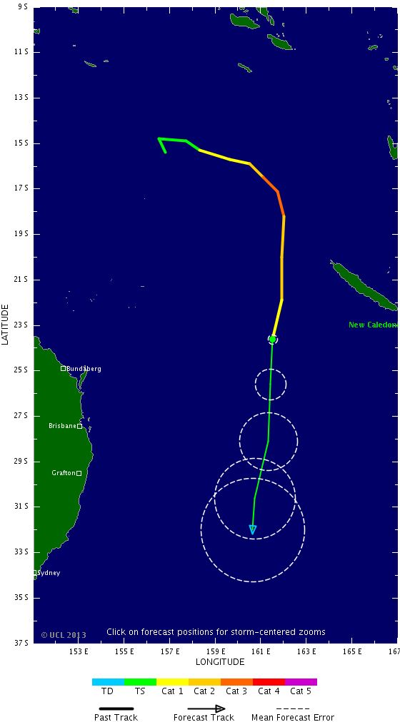 Sa trajectoire, dans un premier temps assez erratique, glisse plus franchement vers le sud-est. Ce cyclone menace donc directement la Nouvelle-Calédonie (il devrait passer à environ 200 km à l'ouest des côtes) à partir de lundi avec de fortes pluies, notamment sur l'ouest de l'archipel, le tout accompagné d'une houle cyclonique très importante (entre 4 et 8 mètres au large).
