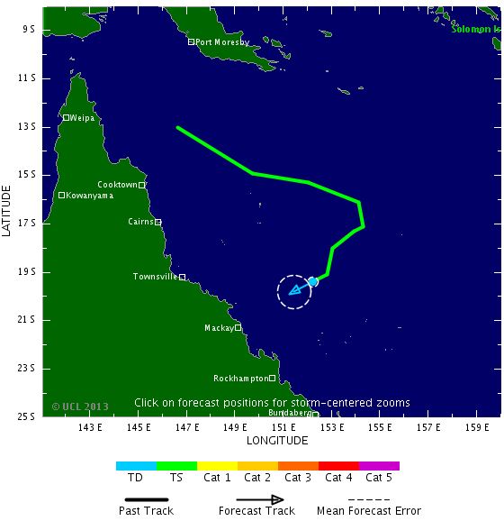 Les conditions seront alors favorables à une incurvation vers le sud-ouest de sa trajectoire, en direction de la côte nord-est de l'Australie. Le point d'impact potentiel se situerait dans la région de Mackay, mais de nombreuses incertitudes sont encore présentes.