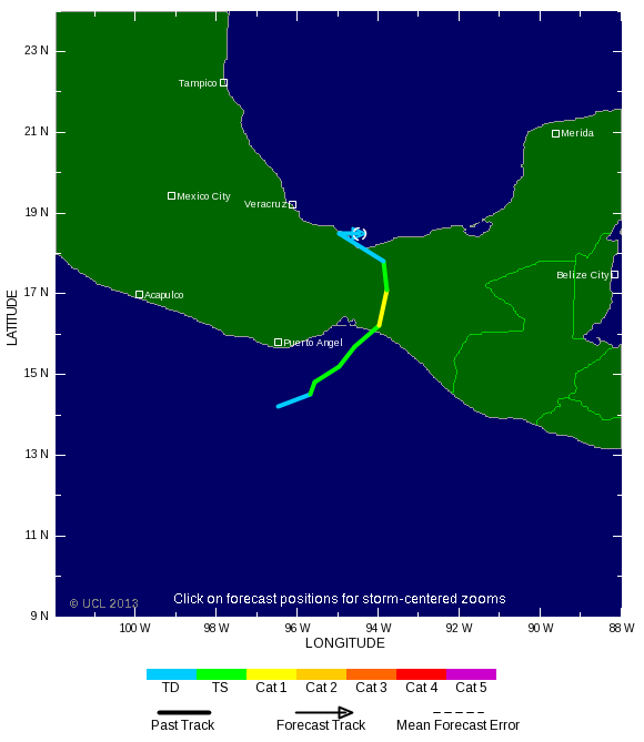 29/05 : La tempête tropicale Barbara s'est formée a proximité des côtes Sud-Est du Mexique (au large de la ville de Puerto Angel) et devrait traverser de part en part l'isthme de Panama dans les prochaines 36 h