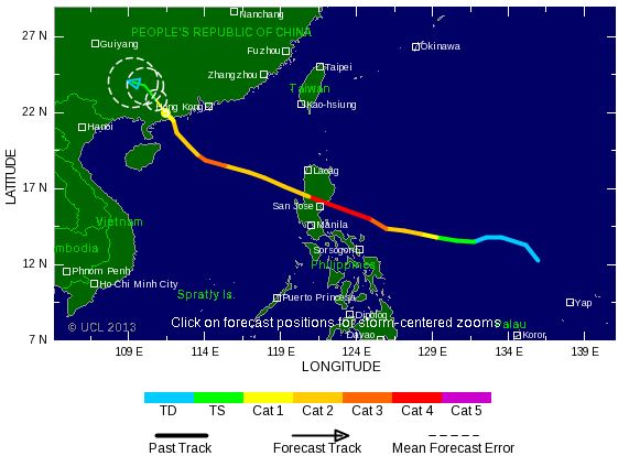 Après avoir quitté les Philippines, Utor devrait conserver sa puissance (3/5) et pourrait soit se diriger vers Hong Kong, soit filer vers le sud en direction du Hainan puis le nord du Vietnam.