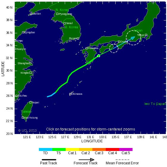 D'ici ce soir, elle aura atteint la région de Tokushima, avec des vents toujours supérieurs à 100 km/h, et une lame d'eau voisine de l'équivalent d'un mois de précipitations. Par la suite, en rencontrant des eaux plus froides, Toraji devrait finir par se dissiper.