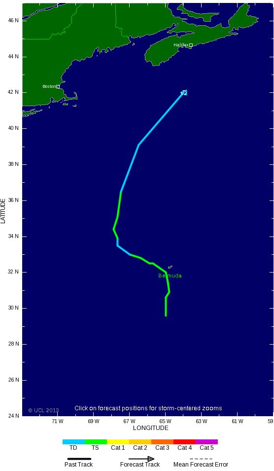 Par la suite, Gabrielle devrait conserver son statut de tempête tropicale, et repartir en mer. Elle fait planer une légère menace pour l'archipel des Bermudes, mais à plus longue échéance.