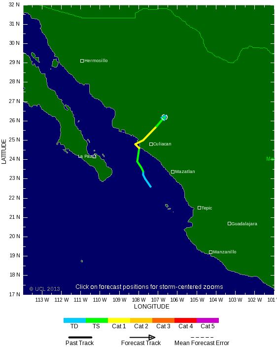 19/09 : le Centre national des ouragans américain (NHC), dans son bulletin de 00H01 GMT jeudi, a précisé que la partie nord de Manuel se trouvait désormais à proximité des côtes du Mexique. Selon les experts américains, l'ouragan se situe à environ 30 kilomètres au sud-ouest d'Altata et à 165 km au sud-est de Los Mochis, deux villes du Mexique. Il se déplace avec des vents pouvant aller jusqu'à 115 km/h et se dirige vers le Nord à une vitesse de 7 km/h en moyenne. Selon le NHC, "un léger renforcement est possible avant que l'ouragan n'atteigne l'intérieur des terres".