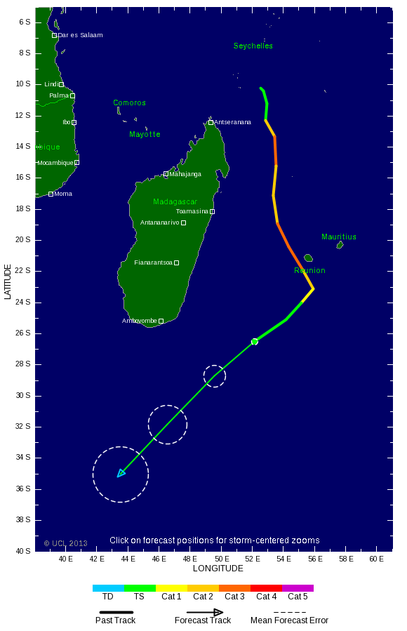 L'île de la Réunion est sur la trajectoire de ce cyclone. Son évolution laisse présager son maintien en catégorie 3 (en prenant l'échelle de Saffir-Simpson comme référence) pour ces prochaines heures avec des rafales pouvant atteindre les 200 km/h entre ce soir et vendredi après-midi, quand il passera au plus près de l'île de la Réunion vendredi matin (à environ 100 km des côtes). A 6h ce matin, des rafales supérieures à 120 km/h étaient déjà mesurées sur l'île.