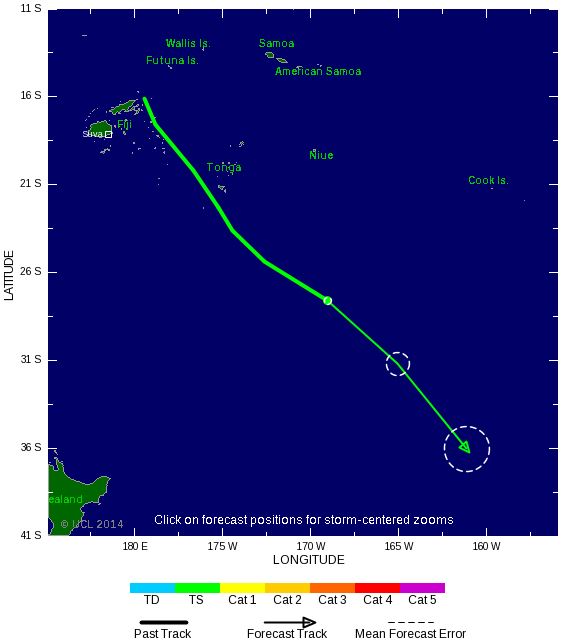 La tempête tropicale 16 s'est formée à l'Est de l'île de Vanu Levu aux Fidji et fait route au Sud-Est. Le système génère des vent souffalnt en rafale à 90 km/h et est accompagnée de fortes pluies.