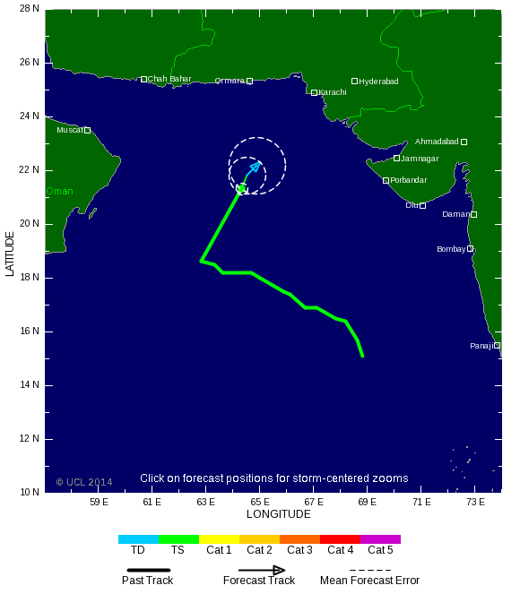 Le système qui génère des vents soufflant à 95 km/h devrait se renforcer en cyclone de catégorie 1 d'ici 36 h. Le système pourrait toucher le Sultanat d'Oman au cours du week-end prochain.
