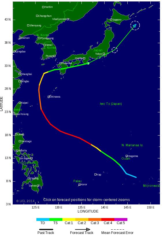 09/07 : Actuellement au sud-ouest de l'île de Kyushu au Japon, le typhon se dirige vers le nord-est à une vitesse de 25 km/h, et prendra ensuite une trajectoire allant vers l'est en direction du Japon, tout en baissant en intensité. La pression au centre du typhon est de 965hPa, il est maintenant retombé en cyclone de catégorie 2, avec des vents soufflants tout de même à 130 km/h.