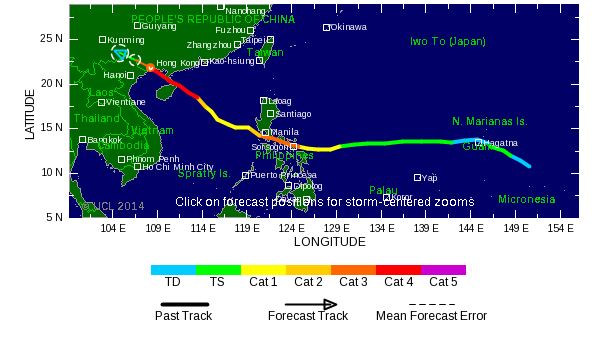 Pour l'instant la trajectoire de ce phénomène est assez incertaine puisqu'il il est possible qu'il continue sa course en direction du nord de l'archipel des Philippines qui 'il traverserait entre mercredi et jeudi prochain, avant d'impacter le sud de la Chine ensuite. Mais ce système pourrait incurver sa trajectoire vers le Nord-ouest, auquel cas l'île de Taïwan serait impactée.