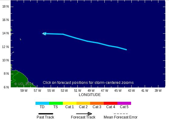 Le système qui génère des vents assez modérés soufflant à 80 km/h et prend cap au nord-ouest vers les Petites Antilles ne dravait pas se renforcer en tempête tropicale avant de toucher les Antilles. Néanmoins, cette dépression est accompagnée de très fortes pluies à caractère orageux et devrait directement affecter les îles du centre des Petites Antilles (Guadeloupe et Martinique notamment). Ces fortes plujies sont susceptibles de causer des inondations et des glissements de terrain.