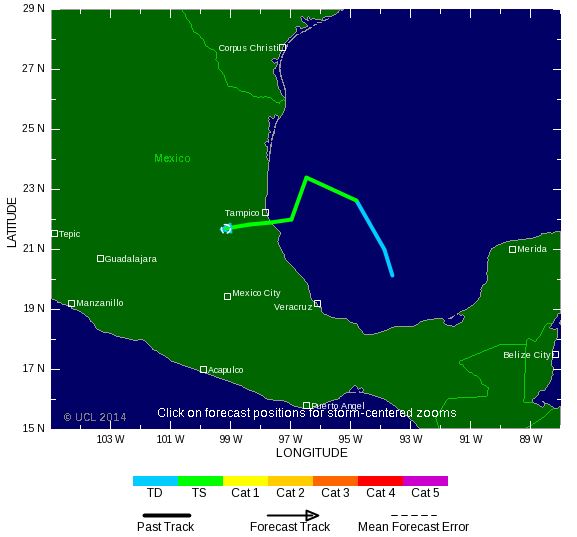Cette tempête tropicale, formée dans le Golfe du Mexique, pourrait déverser des lames d'eau de 150 à 250 mm sur les Etats mexicains du Tamaulipas, de Veracruz et de San Luis Potosi.