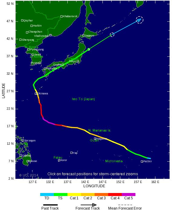 Vongfong devrait ensuite incurver sa trajectoire vers le Nord-Nord-Est et adopter une trajectoire semble assez similaire à celle du le typhon Phanfone. Il devrait atteindre lintensité 4/5 (selon l’échelle de Saphir-Simpson) au large des îles Mariannes et celles d'Okinawa mercredi prochain et pourrait affecter le littoral du Sud de l'archipel.