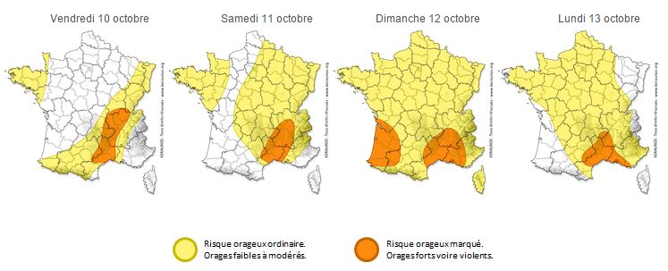 L'épisode orageux intense démarrera en fin de nuit prochaine sur l'Aude puis se renforcera progressivement en gagnant l'Hérault et le Gard (dès les tous premiers reliefs), ainsi que le sud-est de la Lozère et l'Ardèche. Sur l'Aude, les orages donneront de forts cumuls de précipitations sur de courtes périodes (de l'ordre de 80 mm en quelques heures) puis pluies et orages s'affaibliront en matinée.