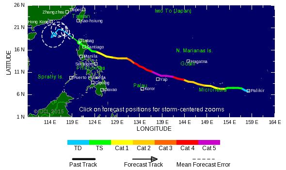 Le système devrait poursuivre sa route vers le Nord-Ouest et devrait perdre un peu d'intensité. Cependant, il est fort probable que Maysak termine sa course sur le Nord des Philippines qu'il devrait atteindre le 4 avril. A cette échéance le typhon serait encore un système de catégorie 3 ou 2 avec des vents soufflant entre 180 et 210 km/h