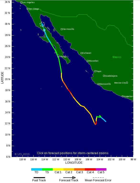 Par la suite, Blanco devrait perdre en puissance mais pourrait tout même toucher la péninsule de la Basse Californie le 07 ou 08 juin. A cette date le système pourrait toujours être un cyclone de classe 1 ou 2.