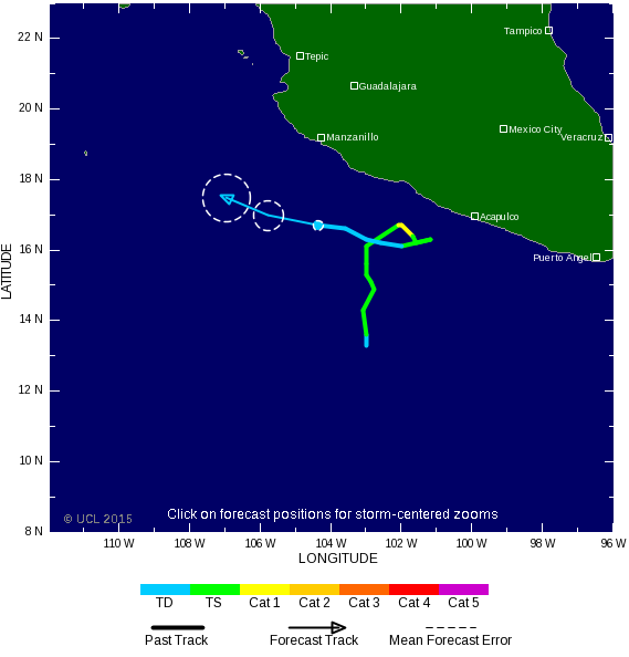 28/09: La tempête tropicale Marty s'est formée au large des côtes occidentale du Mexique et se dirige actuellement plein Nord ce qui va l'amener à se rapprocher fortement du littoral mexicain entre Acapulco et Manzanillo. D'ici 12 h, le système devrait cependant changer de cap pour adopter une trajectoire plein Ouest ce qui le fera s'éloigner du littoral.