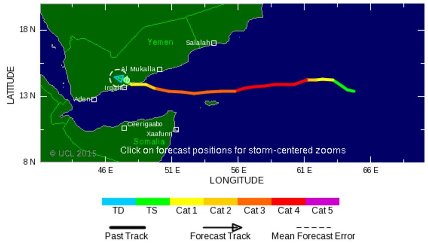 Les dernières prévisions envisagent que le cyclone devrait s'abattre sur l'Est du Yémen entre le 02 et le 03 novembre prochain. A cette échéance, le cyclone devrait avoir perdu un peu de sa vigueur et être reclassé en cyclone de catégorie 2 avec des vents soufflant à 150 km/h et de très fortes pluies.
