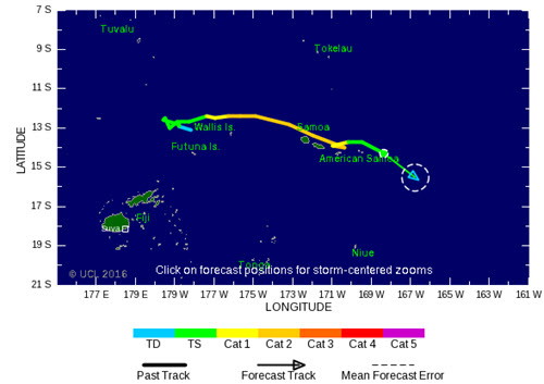 Le système ne devrait pas touché directement les îles de Wallis et Futuna mais il pourrait les affecter fortement avec notamment des pluies intenses. A plus longue échéance, la tempête pourrait toucher l'archipel des îles Samoa.