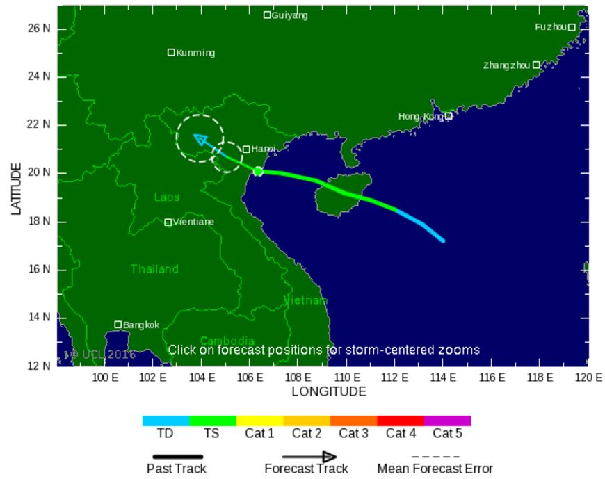La tempête tropicale s'est formée au large de l'île chinoise de Hainan et devrait traverser cette dernière dans les prochaines heures puis se dirigera vers le Nord-Est du Vietnam. Le système génère des vents soufflant à 90 km/h et de très fortes pluies susceptibles de causer des inondations.